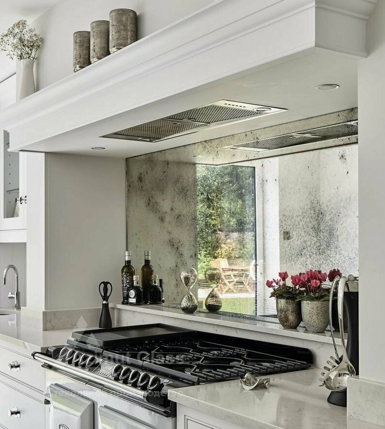 Изделия визуально вытягивают пространство по вертикали и горизонтали, поэтому ими можно дополнить дизайн малогабаритных кухонь. Фартук из состаренного зеркала легко очищается неагрессивными моющими средствами для посуды и составами для стекол. Не рекомендуется использовать абразивы для удаления пятен с поверхности. Стеклянные скинали и плитки с эффектом старины получают двумя способами: