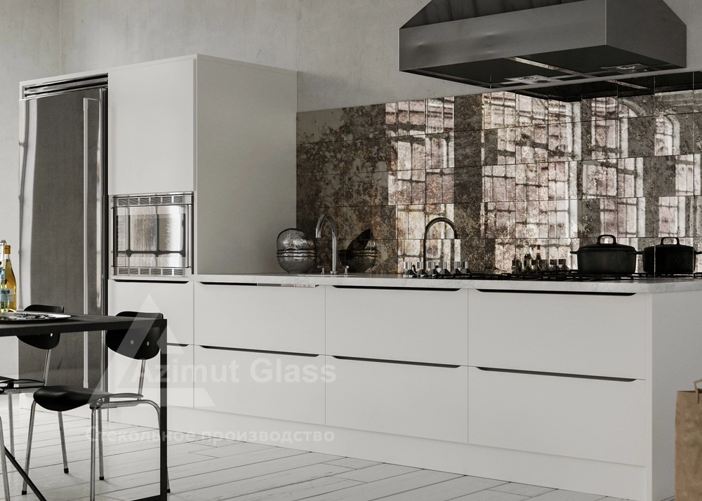 Фартук из состаренного зеркала отлично впишется в кухню современного или классического стиля. На изделии с такой поверхностью меньше заметны загрязнения, капли воды и жира. Зеркальная поверхность устойчива к воздействию солнечных лучей, бытовой химии.