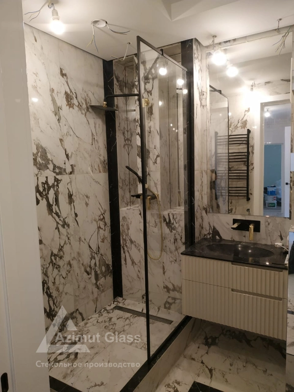 на выходе процессы перегородки для душа из стекла в профиле черного цвета - деревня Мистолово доведены до финиша, конечные виды приняты и оплачены покупателем.