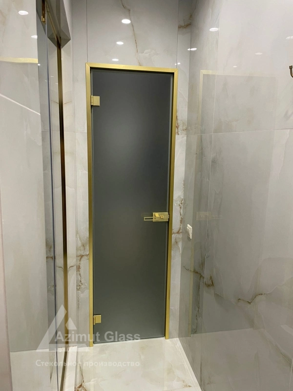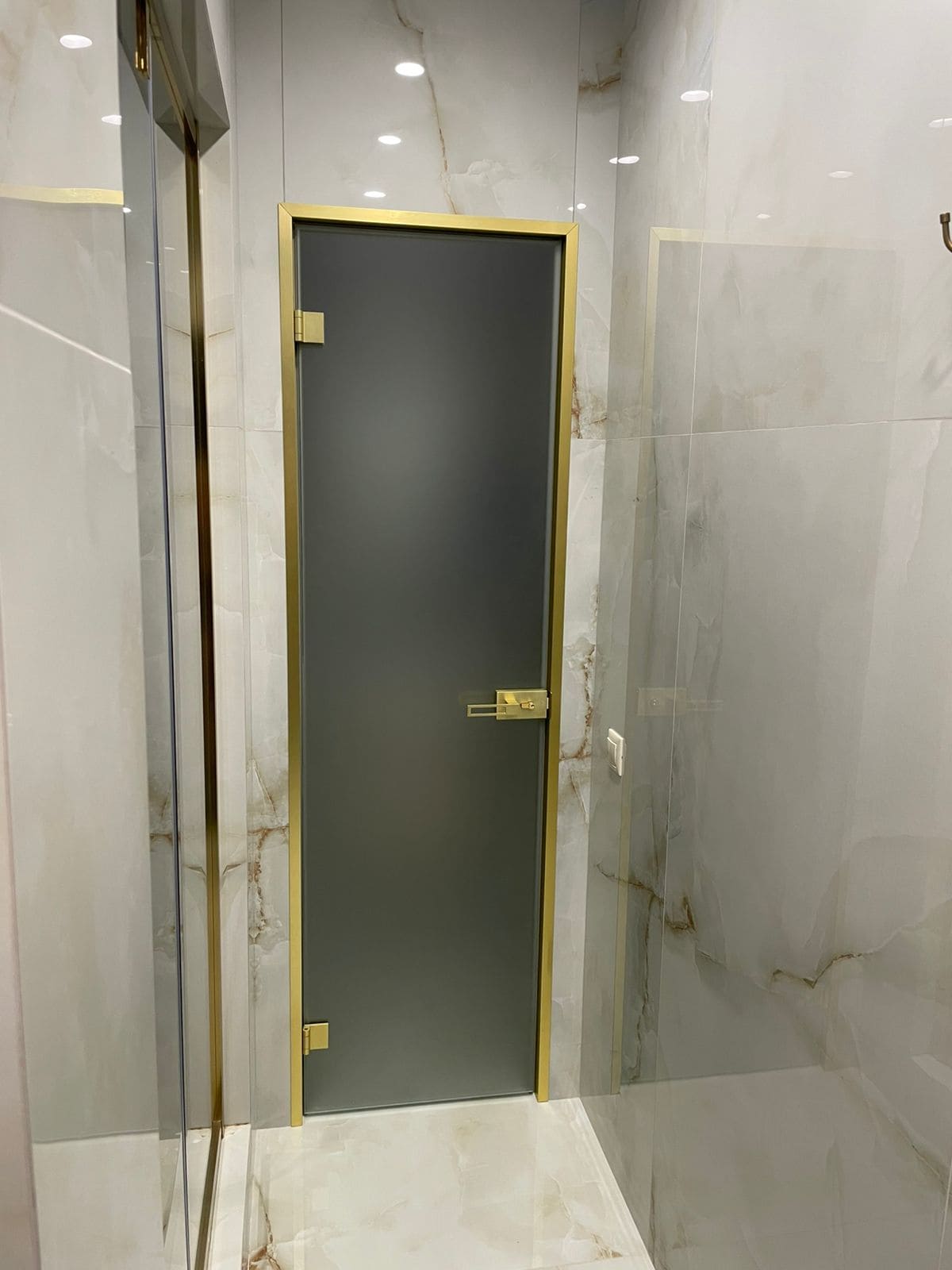затем комплексы мероприятий стеклянной матовой двери графит в коробке из алюминия в санузел в Ломоносове доведены до финиша, последние редакции осмотрены и проплачены покупателем.
